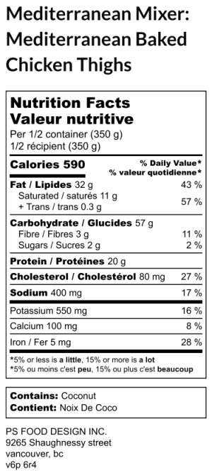 Hover For Ingredients Chicken thigh, garlic, paprika, allspice, nutmeg, olive oil, lime juice, black pepper, salt, dill, coconut milk, lemon juice, white rice, parsley, mint, onion, tomatoes, lemon pepper seasonings, cucumber, lemon juice, herbs & spices4.00 out of 5$20.25 Customize Login or Register to BuyMediterranean baked chicken thighs, marinated in an aromatic blend of paprika, garlic, allspice, nutmeg, fresh lime & fresh herbs, served over jasmine rice tabbouleh with house made coconut-dill sauce