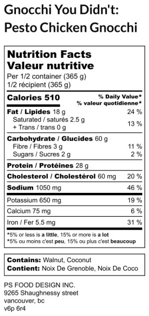 Hover For Ingredients Chicken breast, Italian seasonings, gluten free gnocchi (rehydrated potato flakes, corn flour, potato starch, corn starch, rice flour, salt, lactic acid, sorbic acid, turmeric), walnuts, lemon juice, spinach, garlic, basil, olive oil, coconut water, salt, zucchini, grape tomatoes, herbs & spices0 out of 5$20.25 Customize Login or Register to BuyItalian baked chicken breast over gluten free gnocchi with our house made walnut basil pesto, grape tomatoes & zucchini
