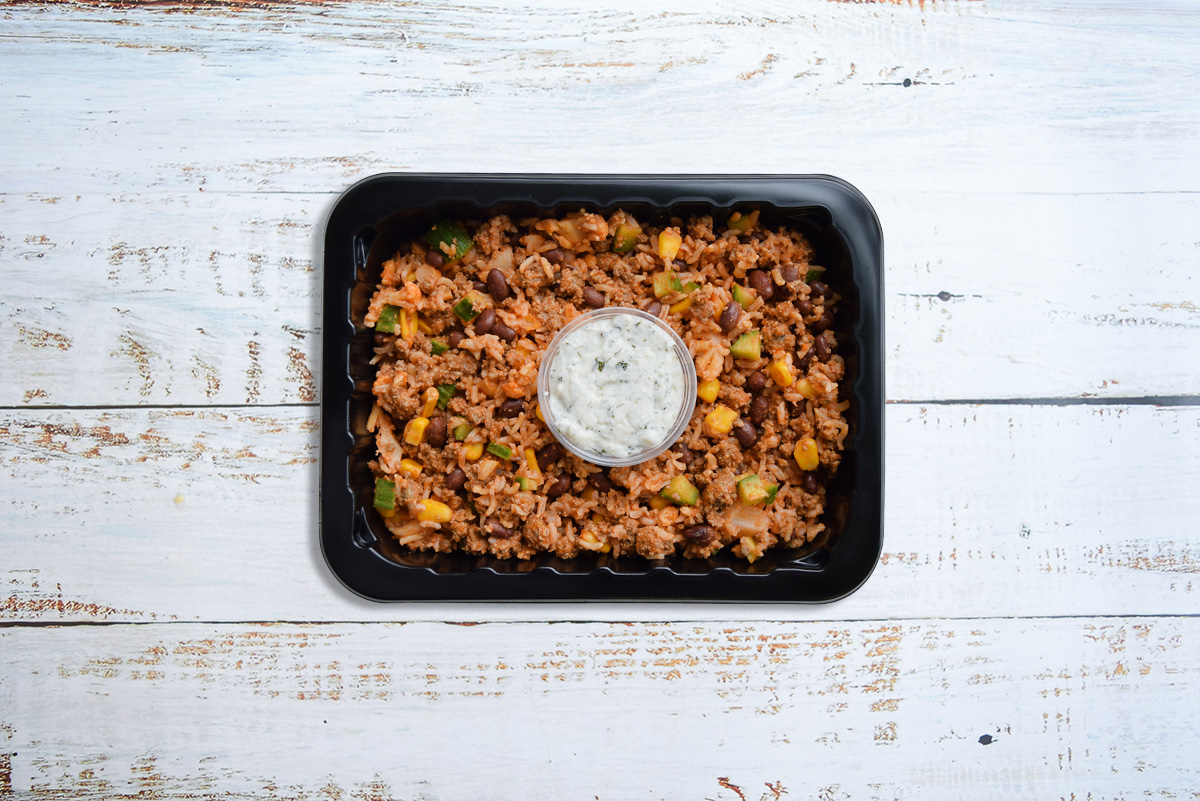 Lean ground beef, brown jasmine rice, cauliflower, cucumber, black beans, corn, hot sauce, sriracha, vegan butter, Greek yoghurt, olive oil, garlic, lemon juice, black pepper, fresh mint, fresh dill, herbs & spices