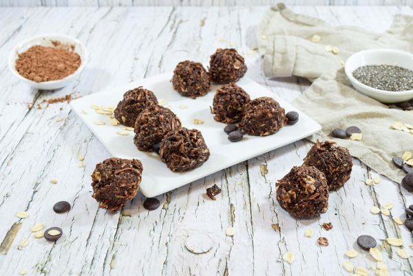 Organic peanut puree rolled with organic coconut oil, organic raw cocoa powder, maple syrup, vanilla, organic gluten free oats, shredded coconut, organic black chia and a touch of sea salt
