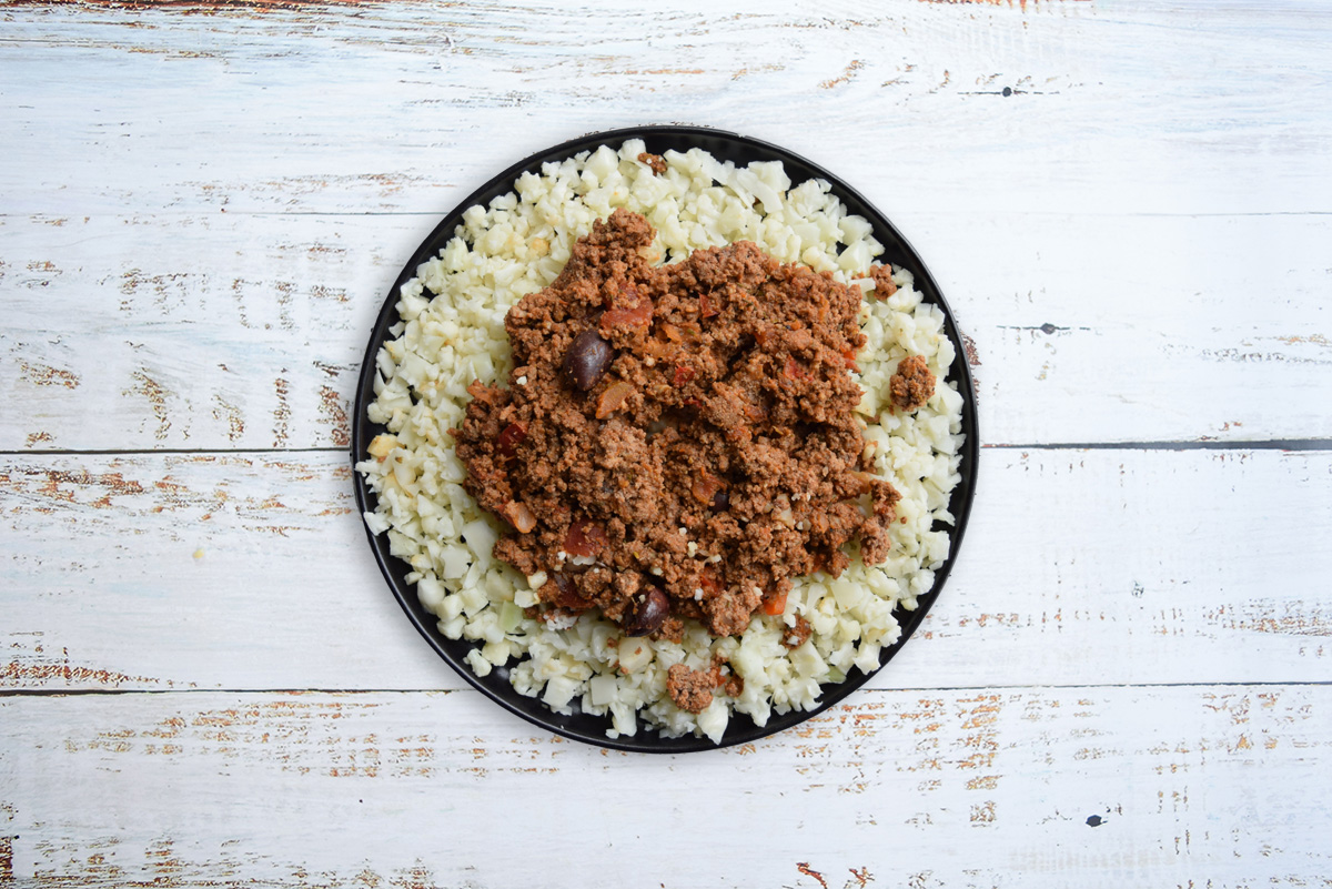 Lean ground beef sautéed with Spanish onion, bell peppers, kalamata olives, tomatoes & spices over cauliflower “rice”