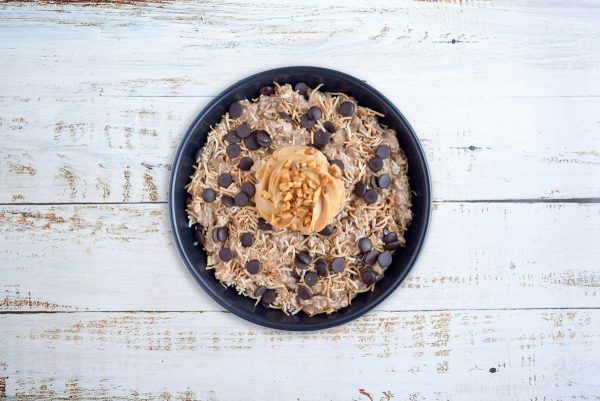 A decadent combination of organic gluten free oats, fresh banana, vegan yoghurt, nut & oat milk, vanilla infused dark cocoa & cinnamon topped with high protein peanut butter mousse & crispy walnuts