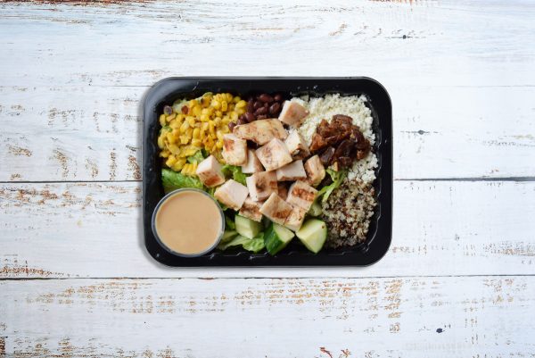 Spicy blackened chicken breast over crisp romaine with organic tricolour quinoa, roasted corn, feta, dates, black beans & our house made peanut lime vinaigrette