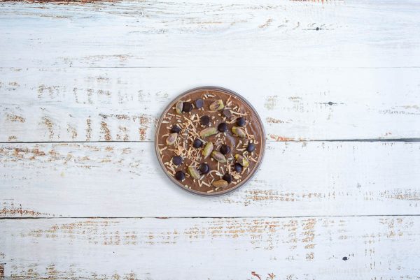 Antioxidant packed dark chocolate melted and whipped with coconut cream, avocado, date puree & cinnamon, topped with toasted pistachios, chocolate & coconut flakes