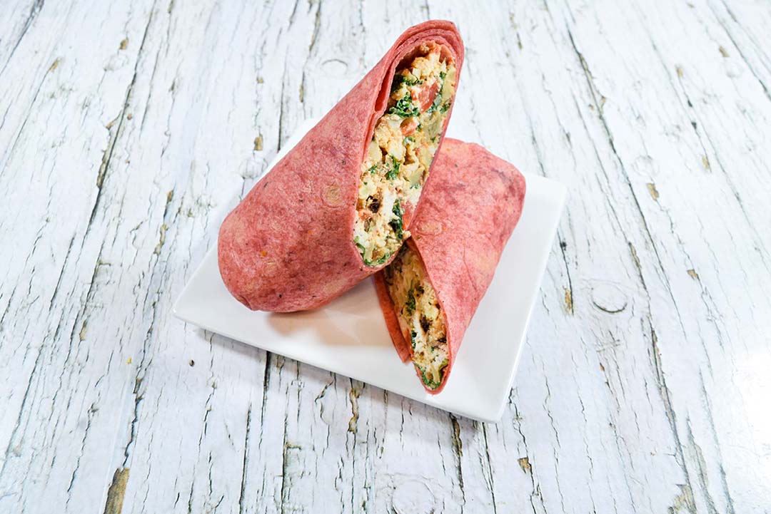 Our tender buffalo chicken tossed with roasted sweet potatoes, organic kale, red bell peppers, goat cheese and our spicy buffalo sauce wrapped up in a yummy 12 inch Roma tomato tortilla