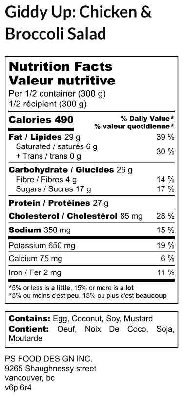 Chicken breast, broccoli, pork bacon, red onion, dried cranberries, sunflower seeds, coconut sugar, white vinegar, light mayonnaise (water, soybean oil, modified cornstarch, sugar, corn, maltodextrin, liquid whole egg, vinegar, salt, liquid egg yolk, mustard, lactic acid, potassium sorbet, phosphoric acid, dried onion, dried garlic, calcium disodium EDTA, spice)