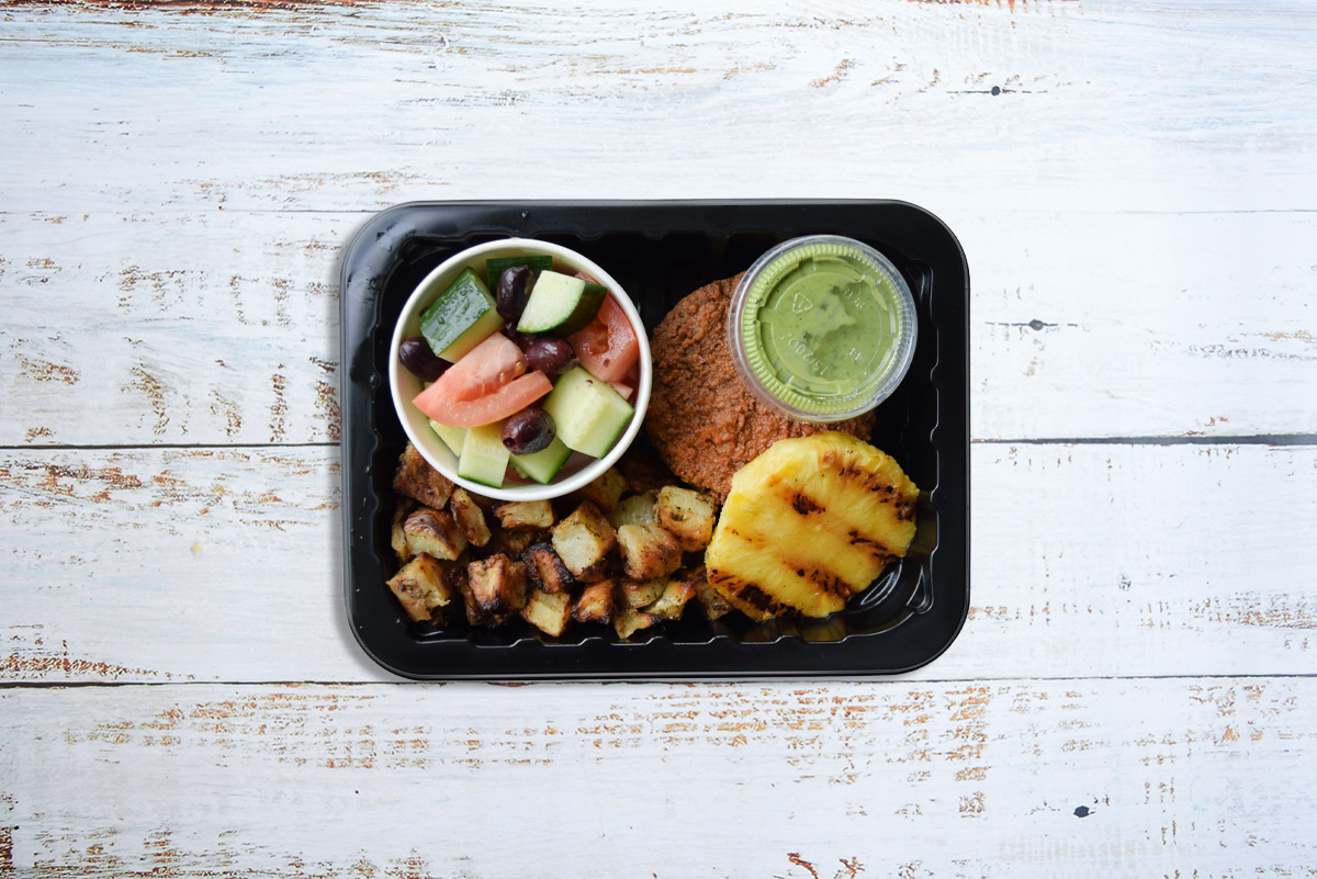 Ground chicken, ginger, garlic, organic raw coconut sugar, tomato puree, sesame oil, salt, black pepper, house made avocado sauce (garlic, avocado, tahini, apple cider vinegar, lemon juice, basil, olive oil, parsley, green onion, salt, black pepper, cayenne pepper, maple syrup, water, coconut water), cucumber, Roma tomato, olives, garlic seasoning, pineapple, golden potatoes, Italian seasonings, herbs & spices