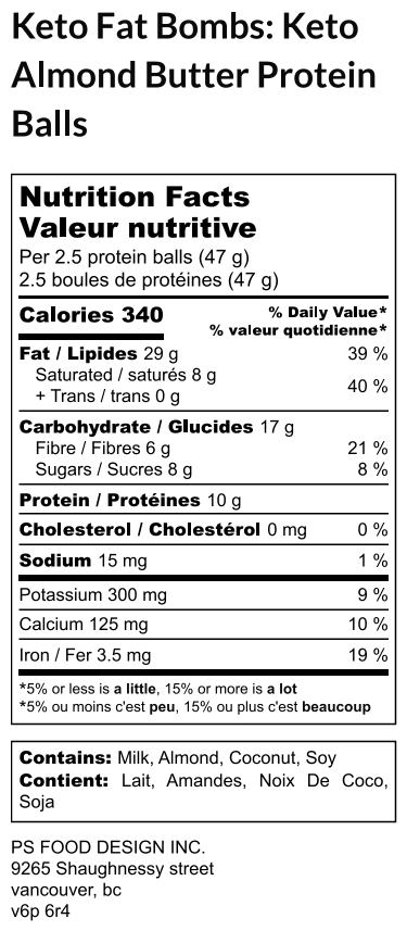 Healthy fat packed almond butter rolled with organic coconut oil, clean whey isolate protein, monk fruit & organic coconut flour dipped in dark chocolate and garnished with raw almonds. Only 12g of net carbs per bag! (package of 5)