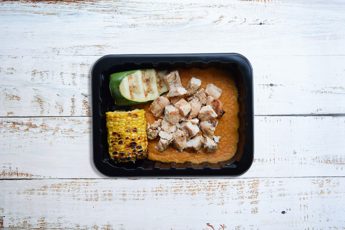 Chicken breast, Korean bbq spices, yam mash (yams, olive oil), corn, zucchini, herbs & spices