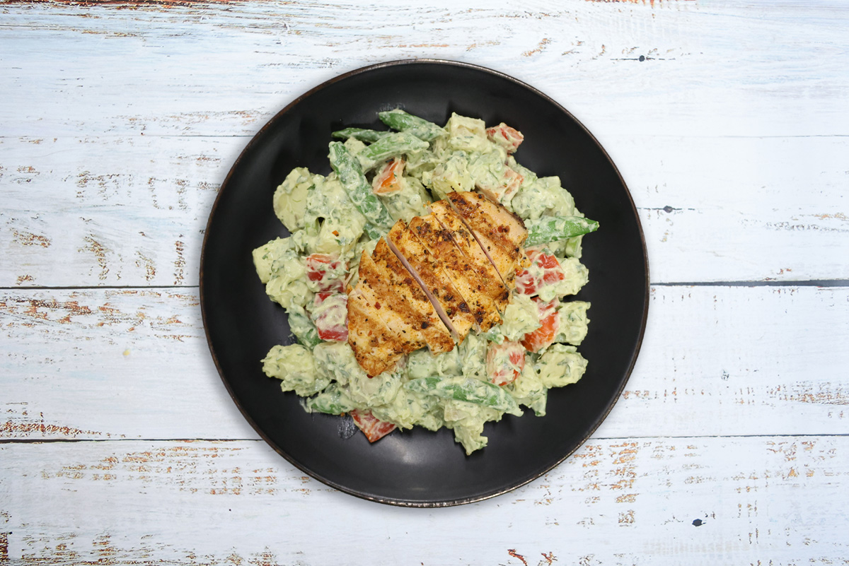 Grilled Piri Piri chicken breast served over our green goddess potato salad with crisp celery, snap peas, red bell pepper and our house-made avocado tarragon sauce