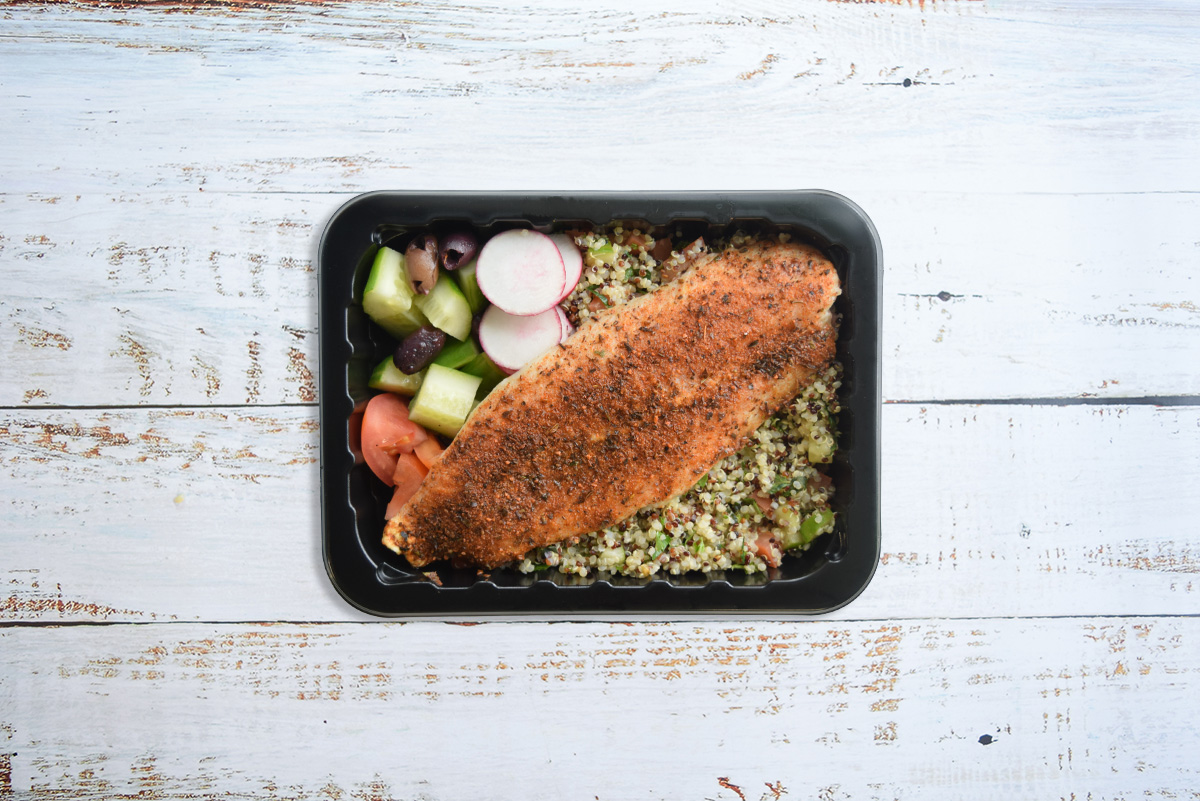 Wild ocean wise cajun basa over Mediterranean quinoa tabbouleh with fresh Roma tomato, feta, radish & Kalamata olives
